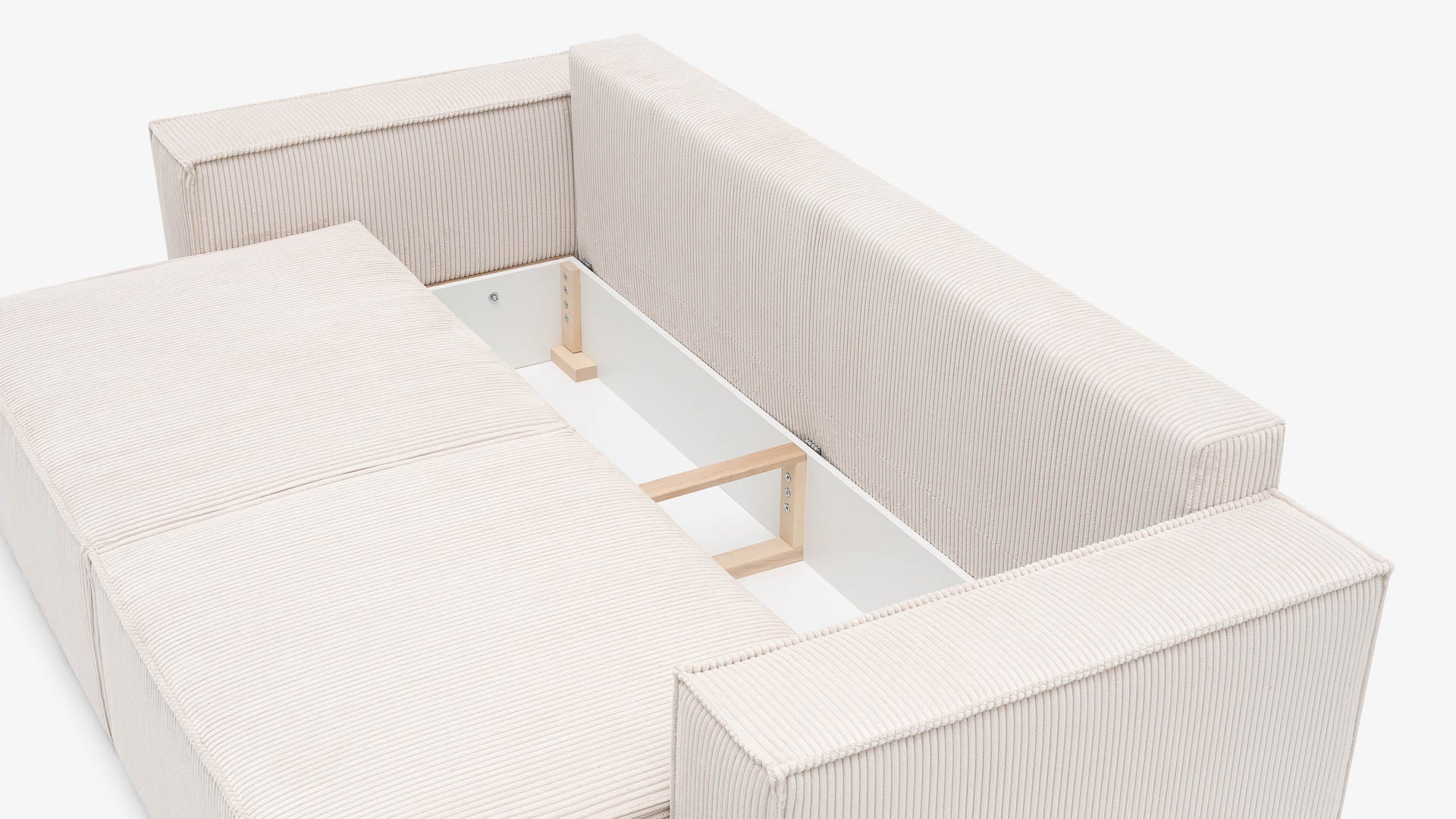Duża, w pełni wykorzystana przestrzeń pod siedziskiem — idealna na pościel i codzienne tekstylia.