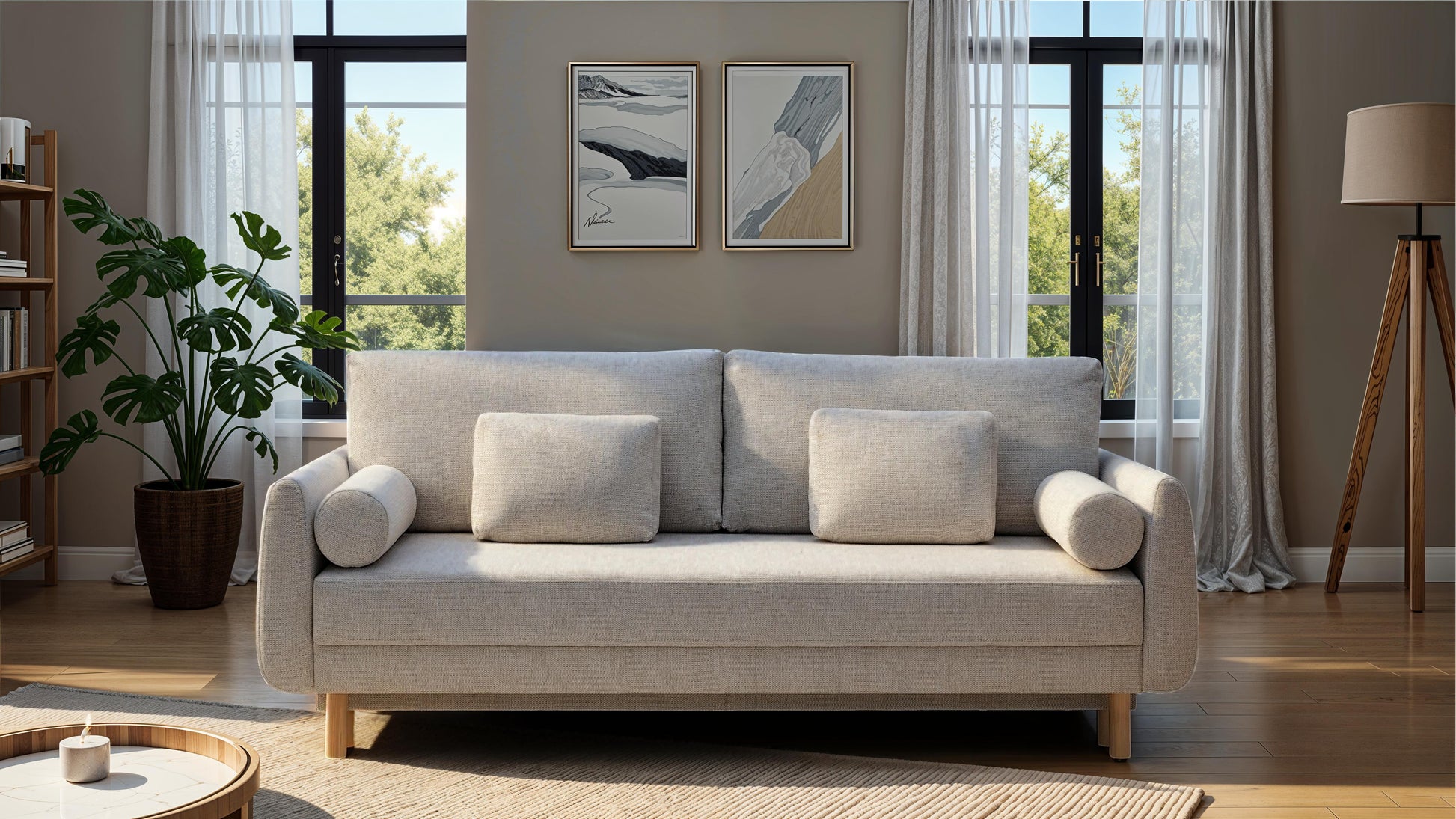 Sofa z funkcją spania rozkłada się do przodu – szybko i wygodnie, dzięki wybranemu automatowi. W wersji z automatem PLUS przednie nóżki nie są potrzebne, bo stabilna podpora wysuwa się automatycznie ze skrzyni. To rozwiązanie łączy wygodę użytkowania z nowoczesną estetyką.