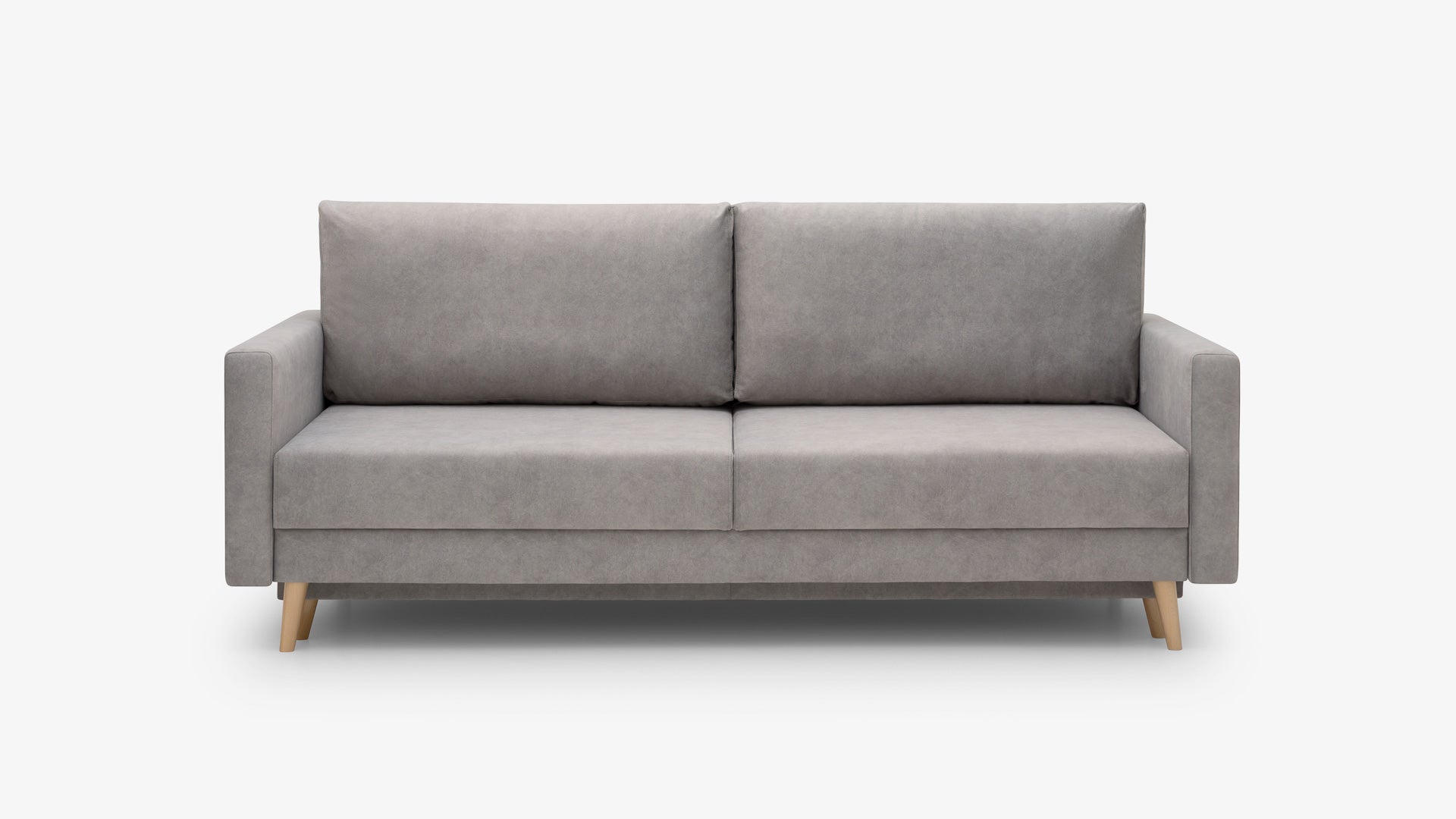 Sofa z funkcją spania rozkłada się do przodu – szybko i wygodnie, dzięki wybranemu automatowi. W wersji z automatem PLUS przednie nóżki nie są potrzebne, bo stabilna podpora wysuwa się automatycznie ze skrzyni. To rozwiązanie łączy wygodę użytkowania z nowoczesną estetyką.